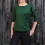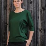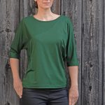 Fledermausshirt mit eingefasstem weitem Ausschnitt und einer diagonalen Teilungsnaht im Vorderteil.