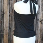 Wunderschönes, rückenfreies Top mit einem Band, welches vorn oder im Rücken zur Schleife gebunden werden kann. Am Saum ist ein Bündchen.