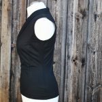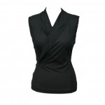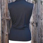Das Top bietet eine ganze Reihe von Tragemöglichkeiten, so ist der Kragen außen locker fallend oder nach innen geschlagen tragbar. An kalten Tagen kann es über ein schmales Shirt mit langen Ärmeln getragen oder mit Armstulpen kombiniert werden.