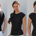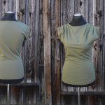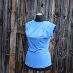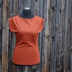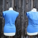 Durch je 3 Falten in der Schulternaht wird der Brustbereich locker umspielt. Im Rücken befinden sich keine Falten. Der Halsausschnitt ist U-Boot-ähnlich, aber etwas tiefer als unser Standard. Es hat eine leicht überschnittene Schulter, das heißt die Schultern sind bedeckt, so dass es gut zu gesellschaftlichen Anlässen oder im Büro getragen werden kann.
